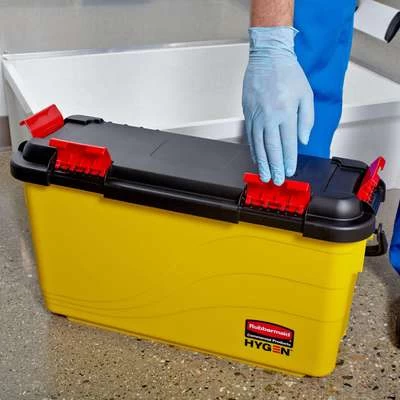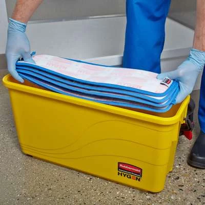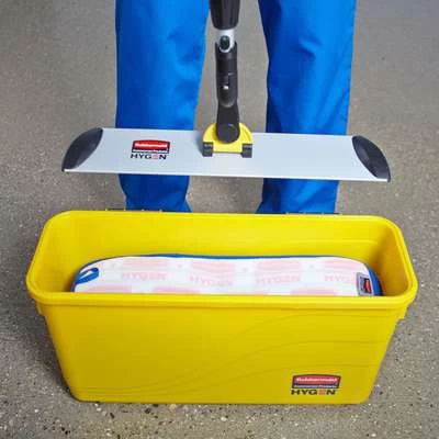 The Rubbermaid Commercial HYGENâ„¢ charging bucket is a disinfecting bucket designed especially for healthcare cleaning. Holds up to 20 microfiber wet pads—generally enough for 1 shift. Watertight, hinged lid facilitates easy opening and closing. Molded-in filling guide and molded-in grate prevents over-saturation. Smooth, nonporous surface helps prevent bacterial growth and cleans easily. Accommodates mops up to 18″ in length.