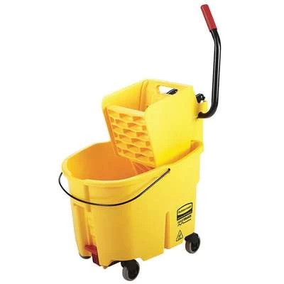 Mop Bucket and Wringer, Capacity 8 3/4 gal, Color Yellow, Wringer Type Side Press, Mechanism Hand Operated, Mop Capacity 10 to 32 oz, Shape Oval, Bucket/Pail Material Plastic, Handle Material Steel, Caster Type 3 in Nonmarking, Overall Height 21 5/8 in, Overall Length 20 5/16 in, Overall Width 16 7/16 in, Color Coding System Yes, Wringer Color Yellow, Wringer Material Plastic/Steel, Bucket/Pail Height 22 in, Bucket/Pail Length 20 1/2 in, Bucket/Pail Width 16 45/64 in, Bottom Drain Yes