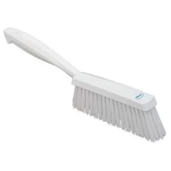 This is a dusting brush with a smooth, ergonomically designed handle. The medium strength bristles remove moist or medium sized particles, such as sugar, chocolate, pastry, vegetable peelings. It is also used as a dustpan brush on floors. Ideal for cleaning where hygiene and cross-contamination are concerns. Use it with other color-coded items for safety and easy identification.