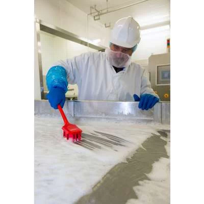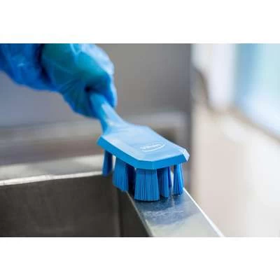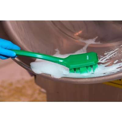 This UST long handled hand brush with stiff bristles is effective when cleaning machines, buckets, containers and tubs in high risk areas. The angled and circular arrangement of the Bristle Security Units enables efficient scrubbing and washing process. This FDA-compliant product is ideal for cleaning where hygiene and cross-contamination are concerns. Use it with other color-coded items for safety and easy identification.